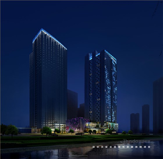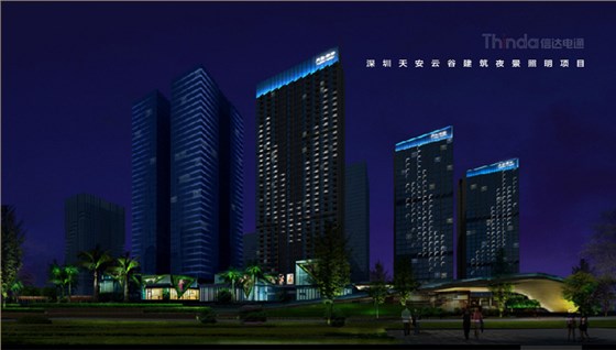 深圳天安云谷夜景照明建筑本身由建筑主體元素延伸至頂部,突出建筑高度和在夜間的遠(yuǎn)觀效果,材質(zhì)為玻璃幕墻。辦公樓建筑立面材質(zhì)為玻璃為主,立面結(jié)構(gòu)縱向延展性好。