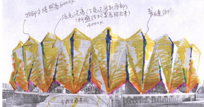 信達電通以“照明充分尊重建筑本身的特點,豎向的亮線使建筑特點在夜景得以重現強化”為照明理念,對博物館和附近的美術館進行統一場館照明設計。在規劃設計中,采用環境光把握光效的明暗色彩節奏。在燈具選用的把控中,采用動態線條燈,突出建筑外立面的效果。在效果實施中,全程落實設計中的照明要點和動態效果,實現設計方案的呈現。